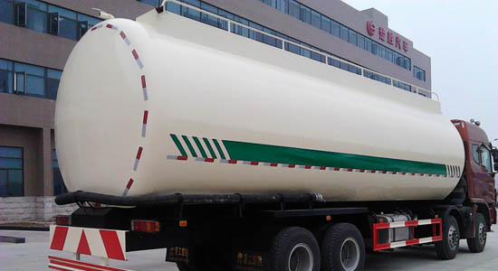 罐體有效容積35立方米.罐體外形尺寸:直段長:8400mm,直徑:2500mm.運輸介質(zhì)煙煤粉,密度0.4噸/立方米.選裝同系列高頂駕駛室,同時平頂,高頂駕駛室選裝無側(cè)風窗及遮陽罩.側(cè)面及后下部防護裝置所用材料為Q235、連接方式為螺栓連接.后部防護裝置的斷面寬和高為100mm×100mm,下邊緣的最大離地高度為476mm.
