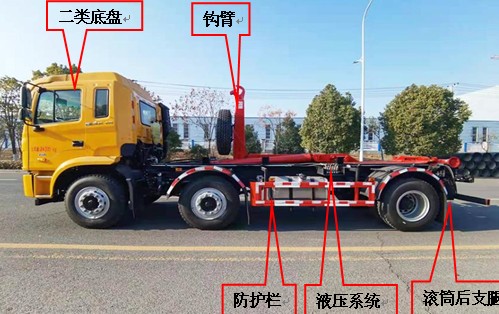 CLW5240ZXX6HH型車廂可卸式垃圾車是在二類汽車底盤的基礎(chǔ)上,加上鉤臂、液壓系統(tǒng)、防護(hù)欄、連接附件等裝置組成,具體如下: