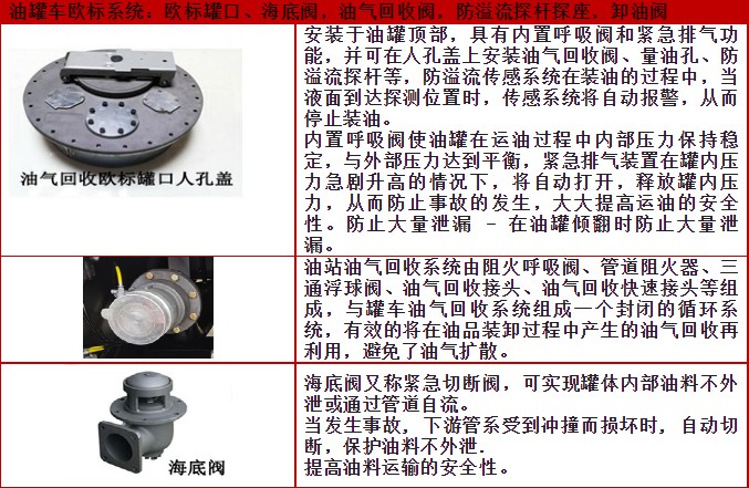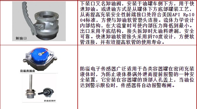 ![]() ![]() 油罐車歐標(biāo)系統(tǒng):歐標(biāo)罐口、海底閥,油氣回收閥,防溢流探桿探座,卸油閥。